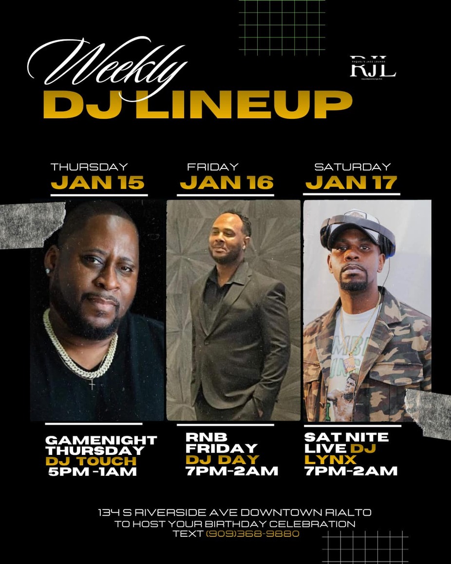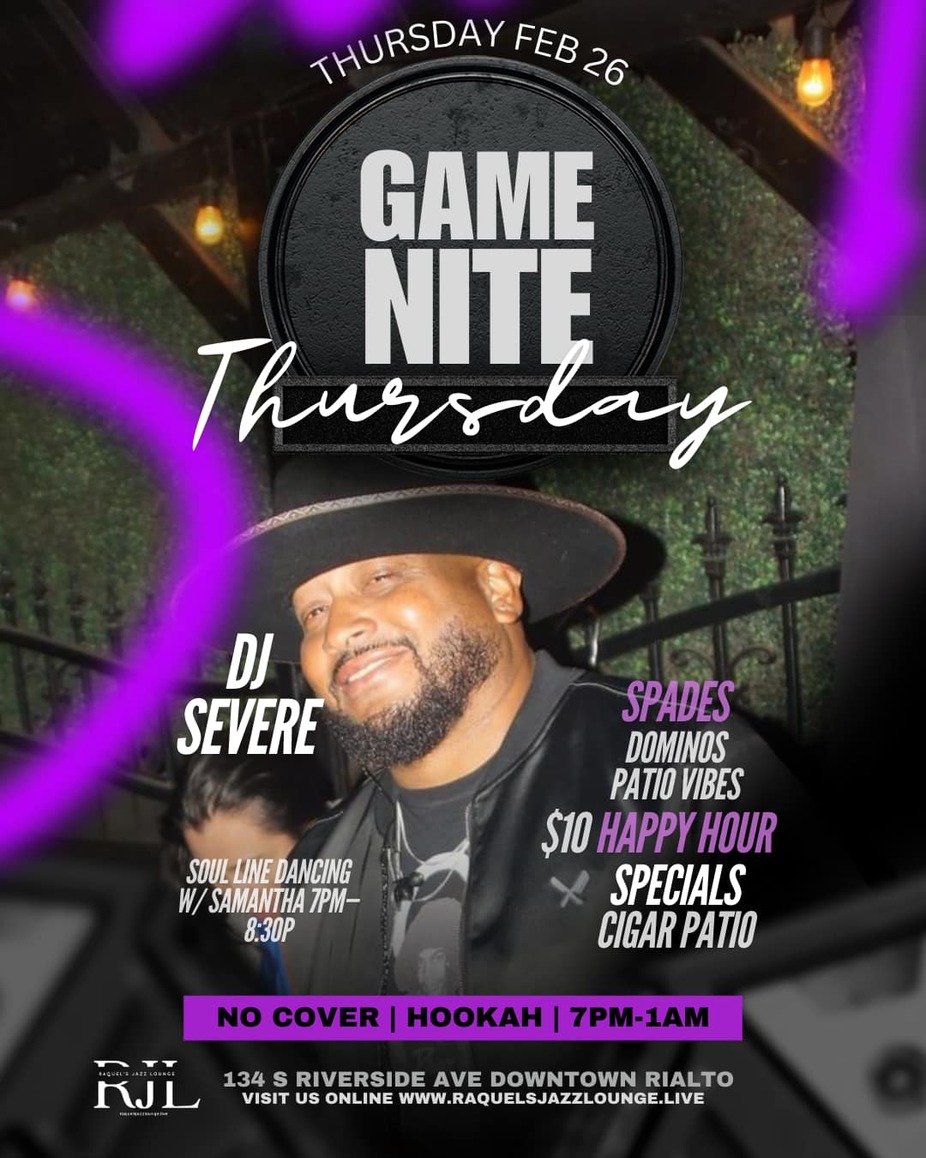 Join us every Thursday at Raquel’s Jazz Lounge for Game night! Enjoy watching sports, playing dominoes, Spades, and more. Thursdays are filled with great energy, and you definitely don’t want to miss out. There’s no cover charge, and plenty of seating awaits you! Need more info? TEXT 909-368-9880