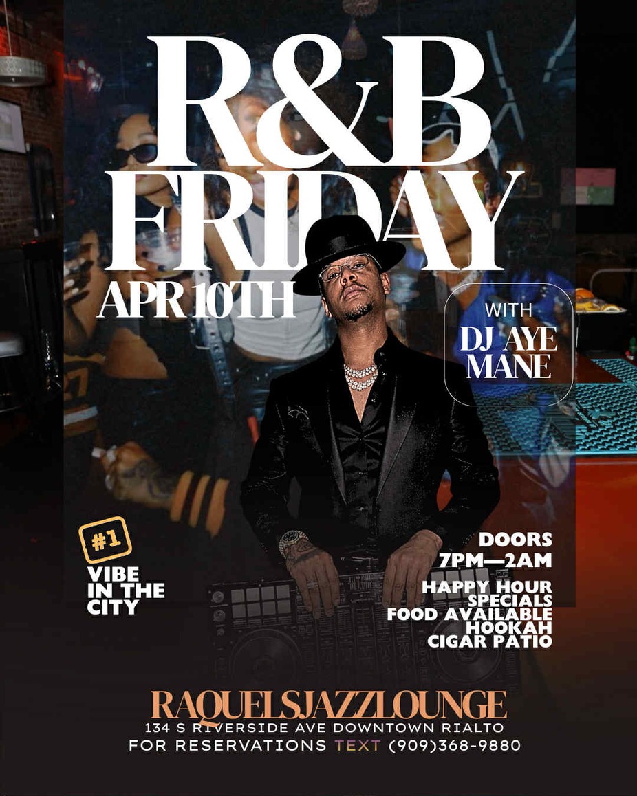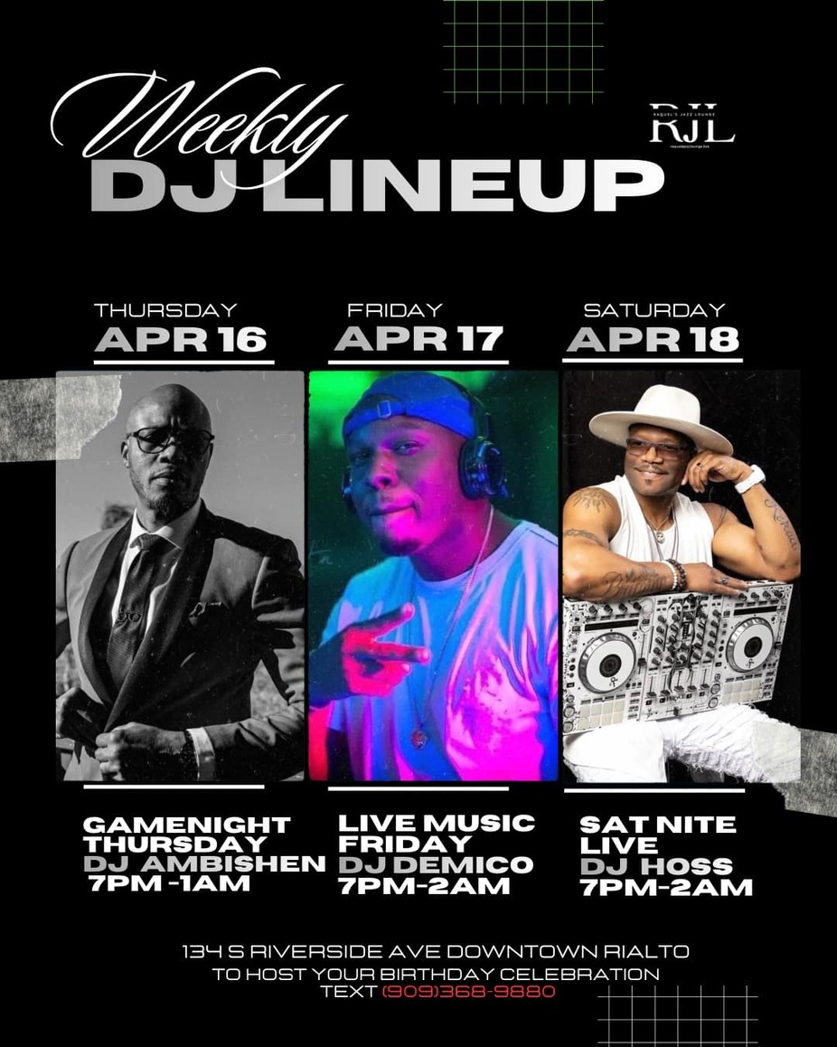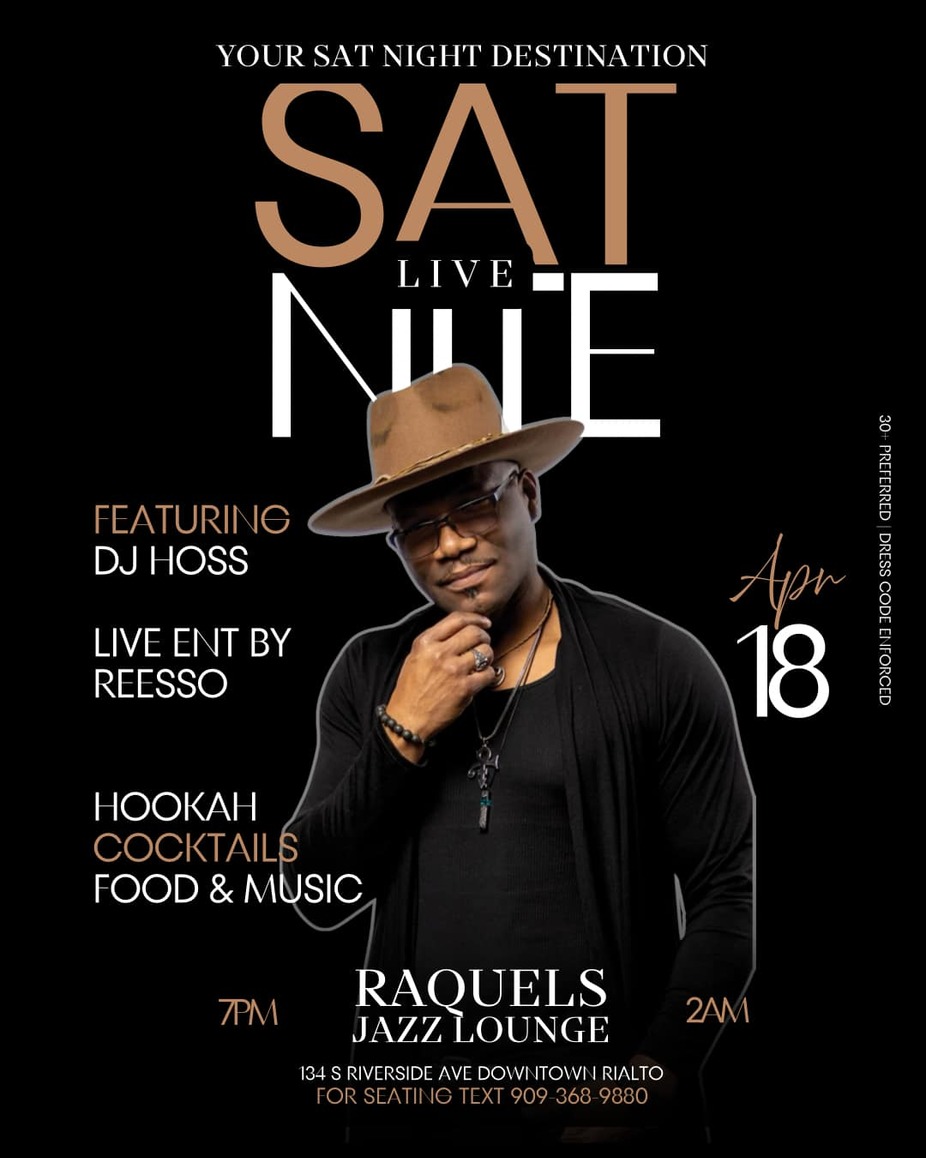 Make sure to experience Raquel's Jazz Lounge every Saturday night! Join us for an unforgettable evening filled with live music and a Live DJ. Be sure to make a reservation to guarantee seating! Text 909-368-9880 for reservations and additional information! Dress to impress, as we have a strict dress code in place. Indulge in exceptional cocktails and enjoy top-tier service for a truly elevated experience.